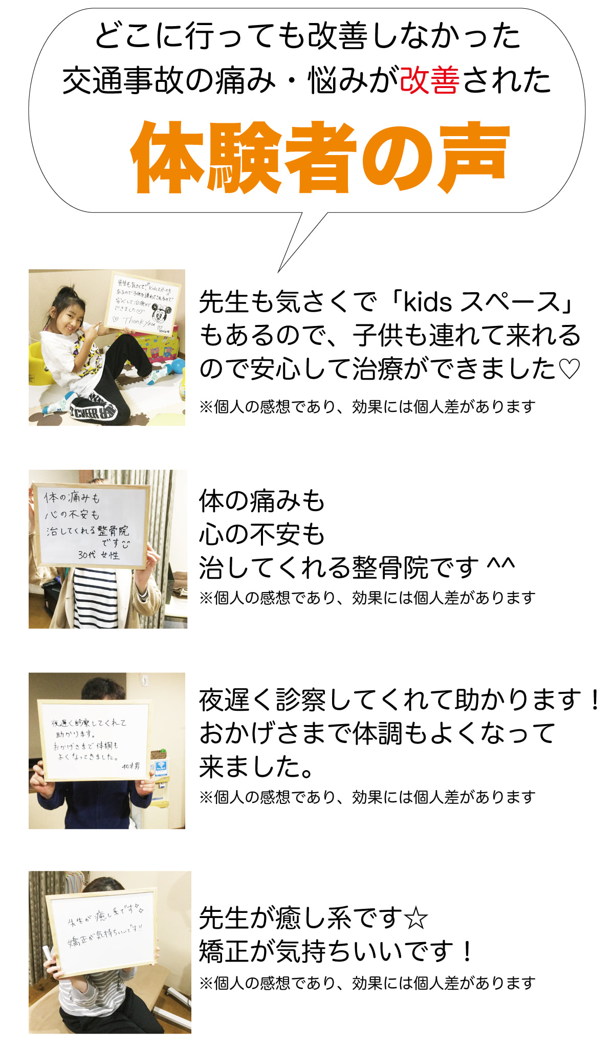交通事故によるむち打ち症の痛みや腰の痛みを共有し、可能な限り後遺症をゼロにして社会復帰して頂けるよう全力を尽くす所存です。